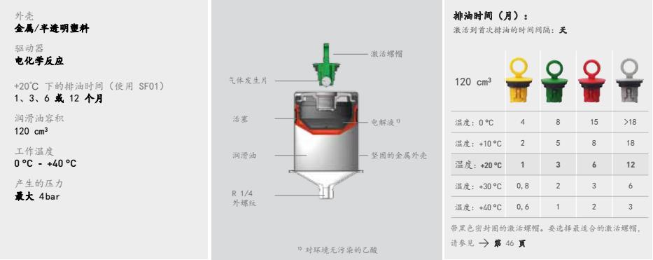 perma CLASSIC 可在 0 °C - +40 °C 的环境温度下使用,其基于电化学反应的工作原理 安全可靠。其润滑周期取决于按颜色编码的激活螺帽。根据应用的具体需求,您可以 分别选择在 1、3、6 或 12 个月内排完 120 cm³ 润滑油。由激活螺帽产生的压力(最 大 4 bar)可推动活塞向前移动,这样就可以持续不断地将润滑油一点一点地注入润滑 点。perma CLASSIC 还能完全防尘和防水,并能承受撞击和意外碰撞。
